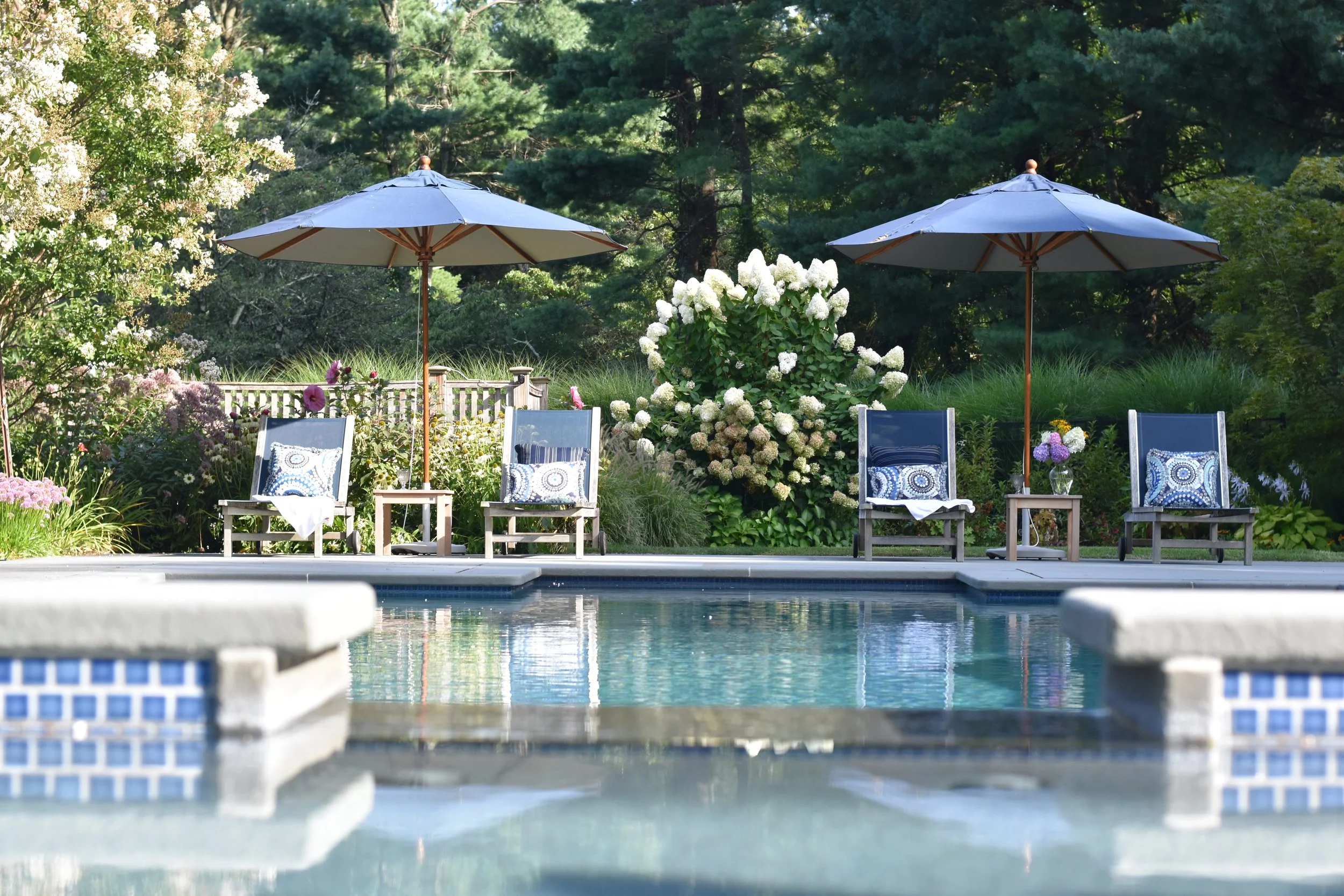 This private space thoughtfully offers both chaise and lounge seating arrangements in one expansive and inviting terrace. Oversized bluestone slabs were installed to complement the generous scale of the area, while also creating simple and elegant lines at the ground plane. Additionally, the plant palette carefully selected for the surrounding gardens includes lush hydrangeas, vibrant roses, and cheerful daylilies to ensure a display of non-stop blooms throughout the summer season.